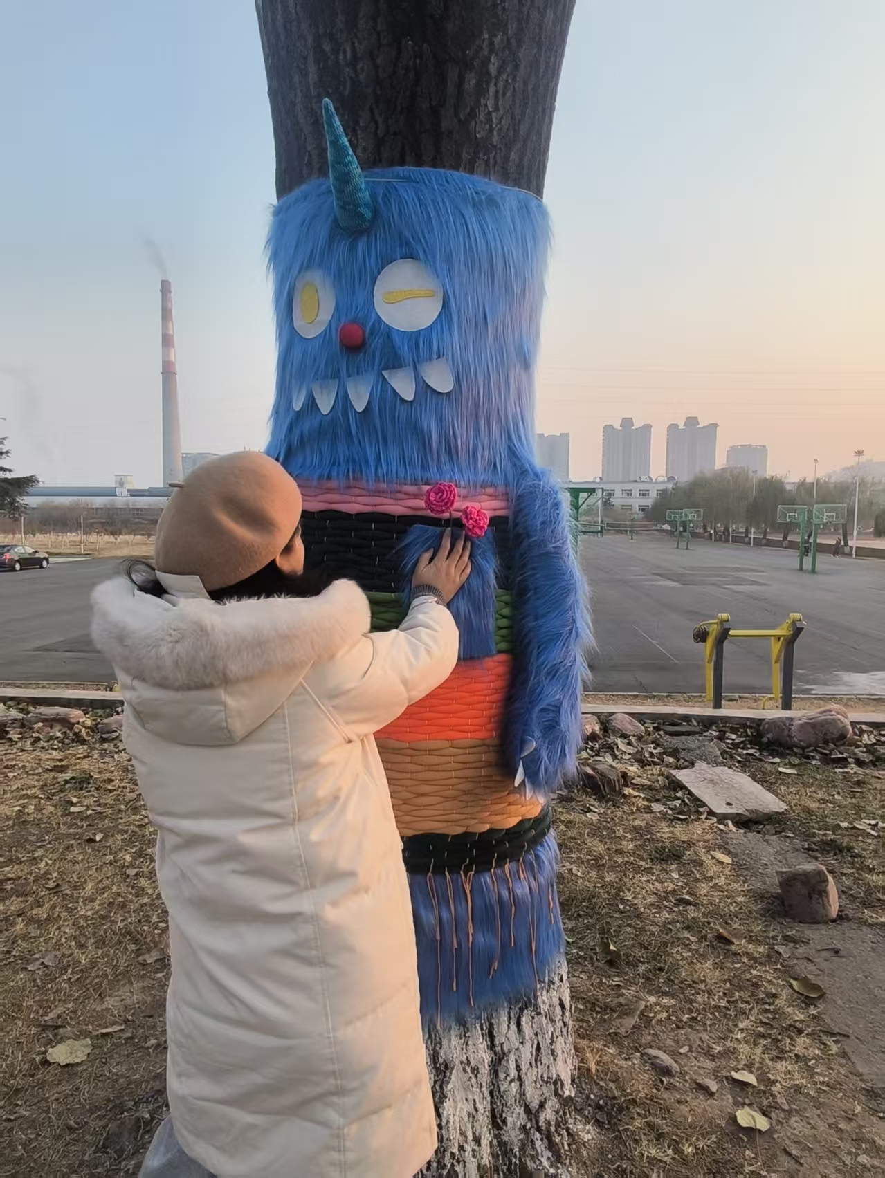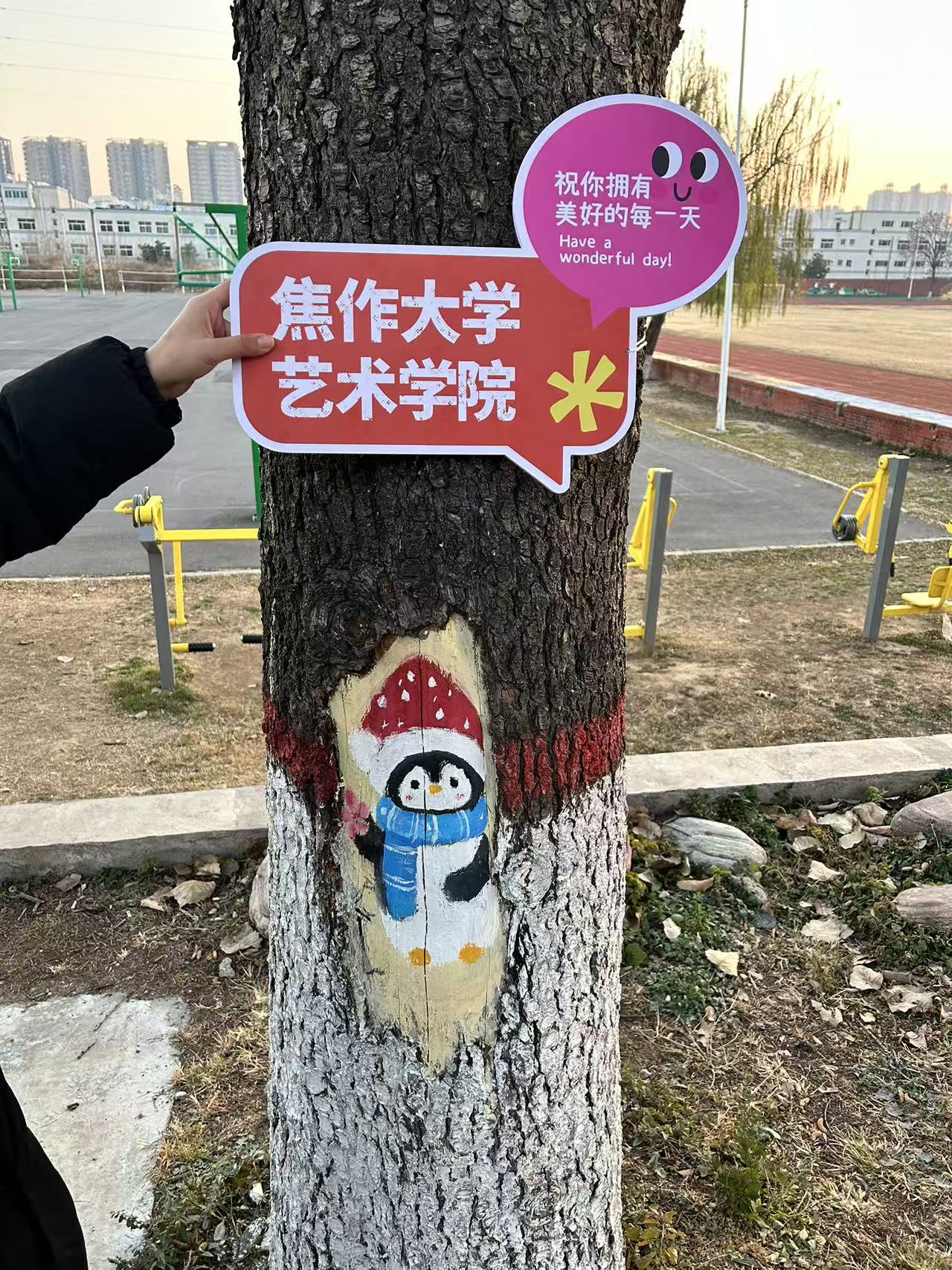 这个冬天,焦作大学北校区的校园里,多了一份可以被感知的温暖。在篮球场北侧,五棵“穿上新衣”的大树静静矗立在冬日阳光下,用柔软的色彩和童趣的形象,回应着每一个路过的人。