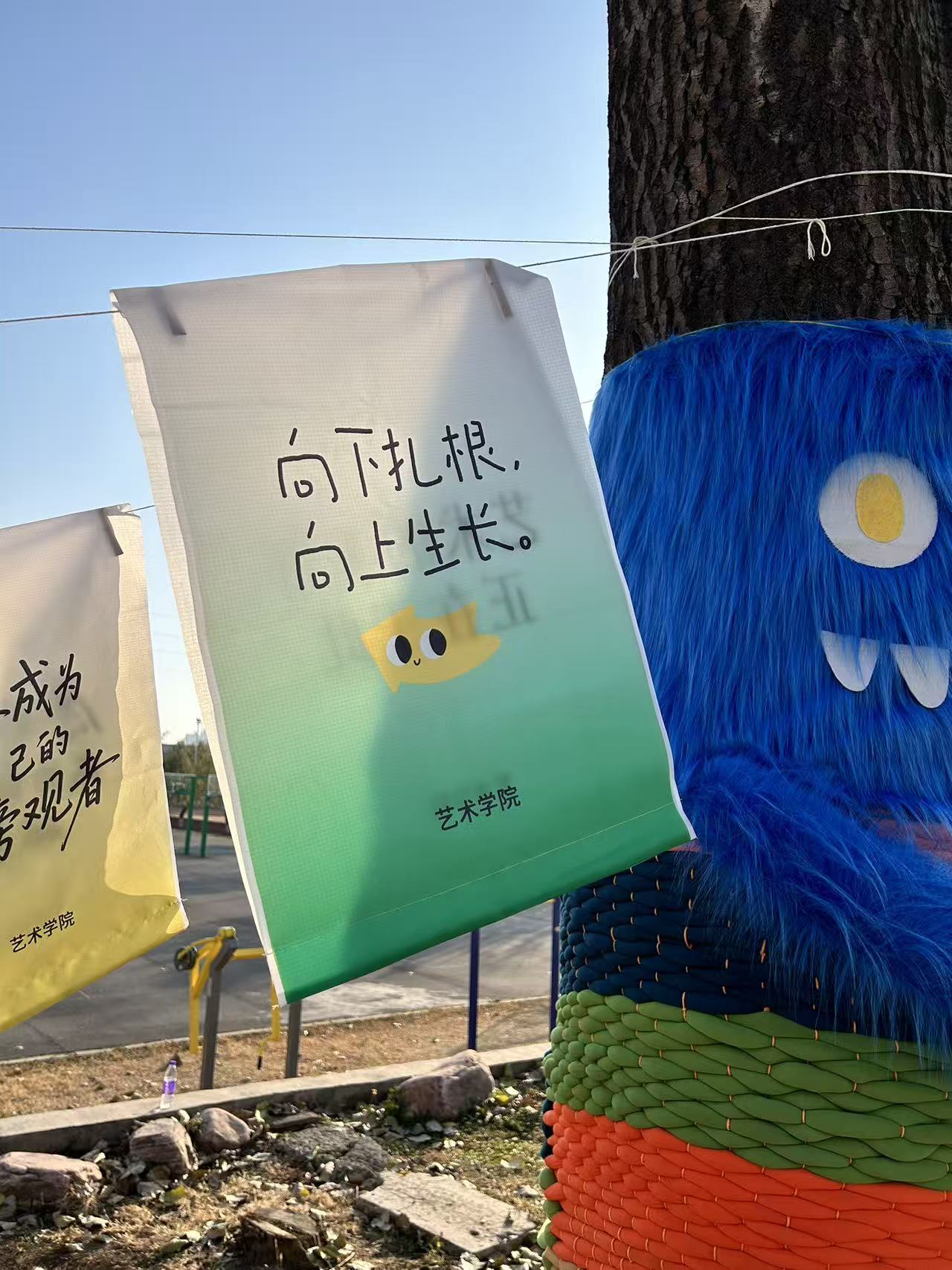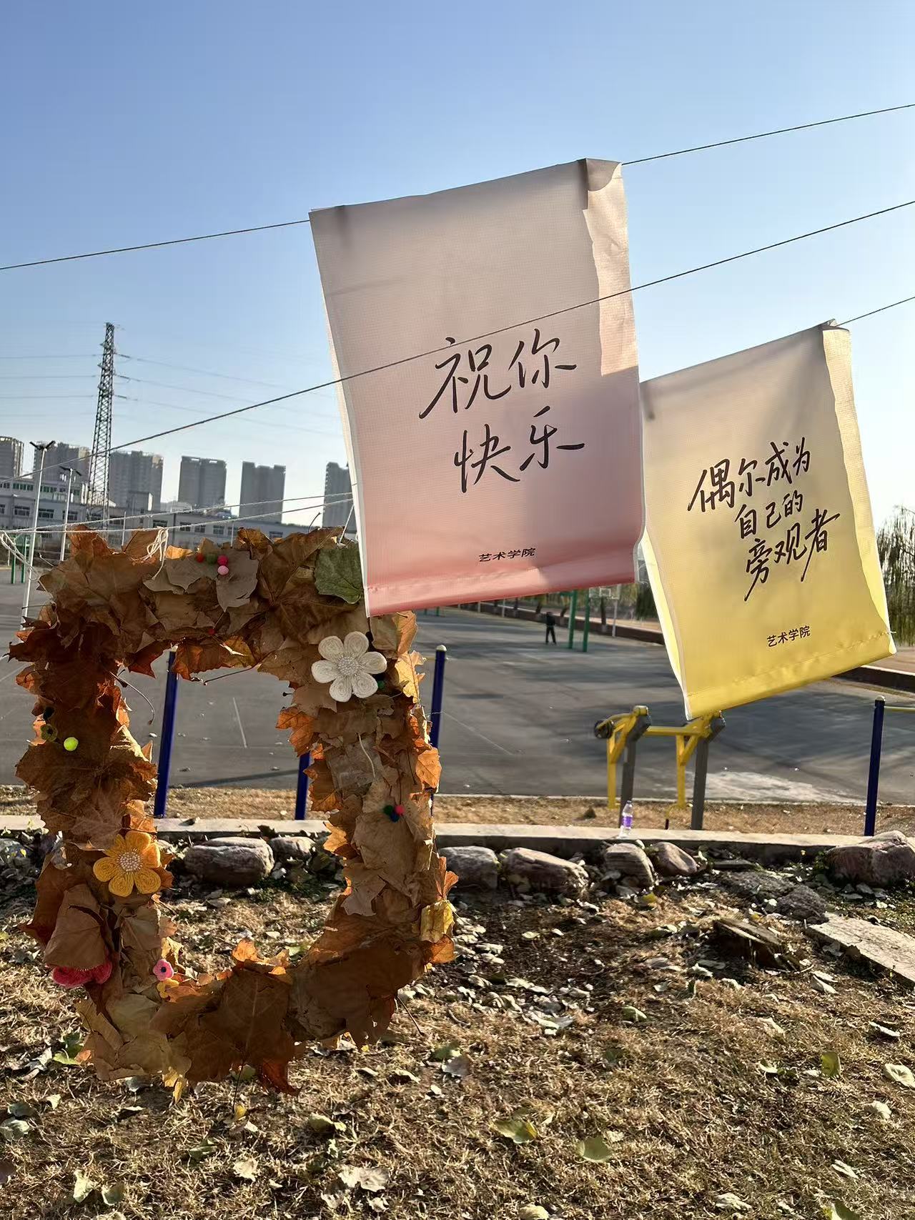 艺术学院希望通过这样的行动,让校园空间不只是学习和生活的场所,也能承载情绪、陪伴与温度。当艺术融入日常,它不再是遥远的作品,而是存在于树旁、操场边、冬日阳光里的温柔力量。